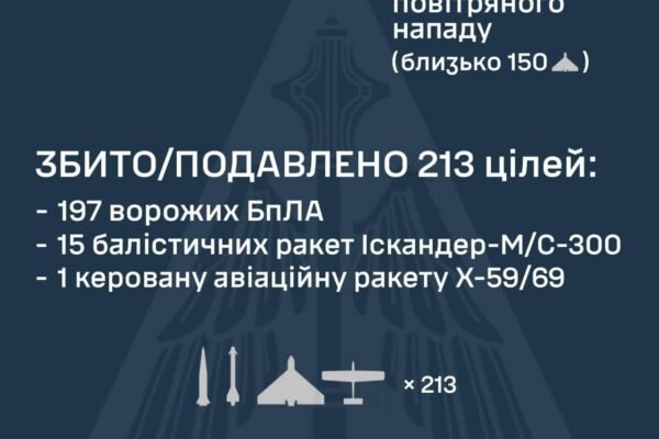 Ворог вдарив по Україні балістикою та дронами: ППО знешкодила 16 із 24 ракет та 197 із 219 БпЛА Про це повідомили в пресслужбі Повітряних сил...