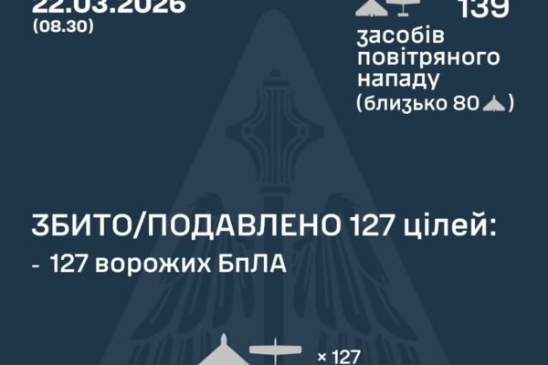 За даними Повітряних Сил, зафіксовано влучання 8 ударних БпЛА на 7 локаціях У Повітряних Силах повідомили, що у ніч на 22 березня росіяни...