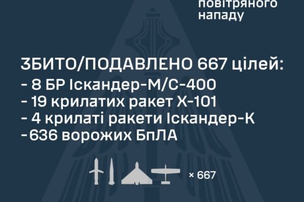 Під час нічної масованої атаки ППО знешкодила 31 ракету та 636 БпЛА Про це інформує пресслужба Повітряних сил ЗСУ, передає Хронікерс....