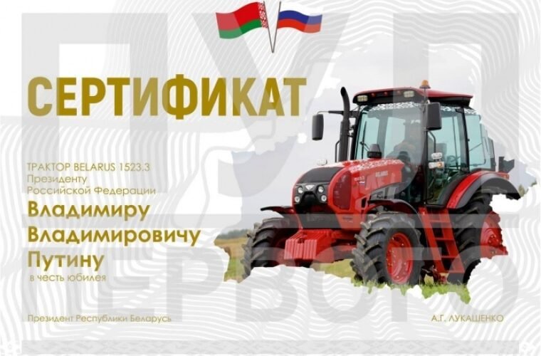 Самопроголошений “президент” Білорусі Олександр Лукашенко подарував російському диктатору Володимиру Путіну на 70-річчя трактор “Беларус”