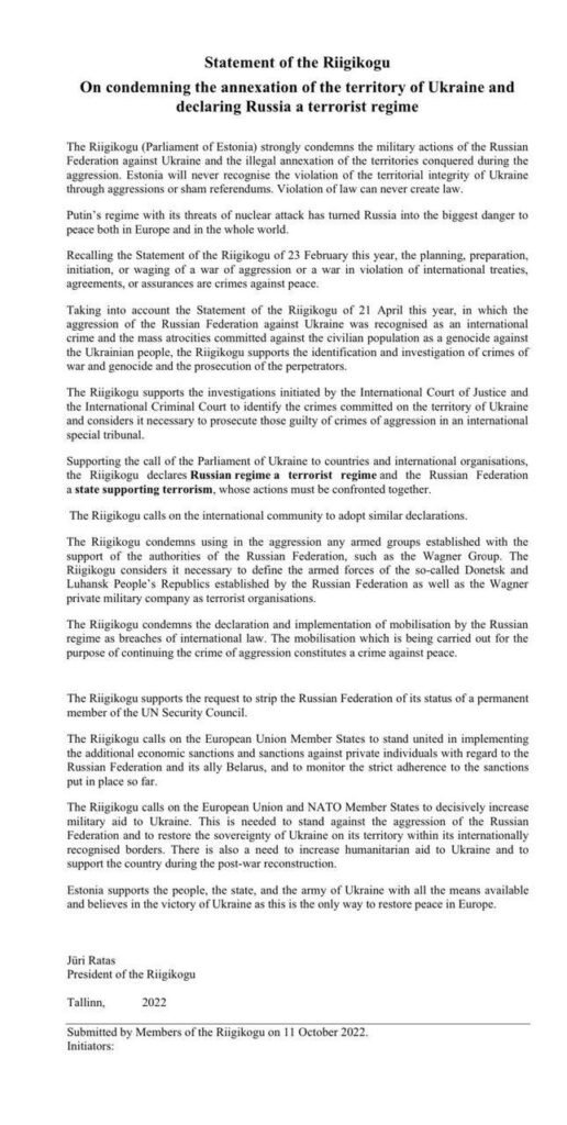 “Підтримуючи заклик парламенту України до держав та міжнародних організацій, Рійгікогу оголошує російський режим терористичним, а РФ – державою-спонсором тероризму, діям якої потрібно спільно дати відсіч. Рійгікогу закликає міжнародну спільноту схвалити аналогічні декларації”, – зазначають у проєкті документа.