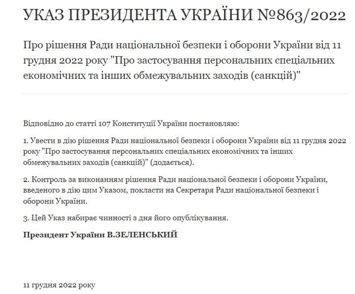 Зазначається, що президент Володимир Зеленський своїм указом ввів у дію рішення РНБО “Про застосування персональних спеціальних економічних та інших обмежувальних заходів (санкцій)”.