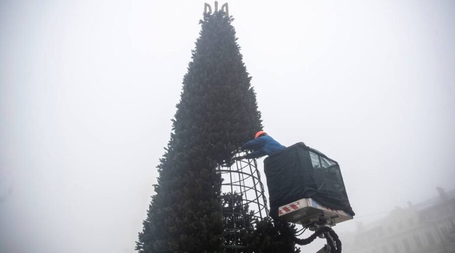 “Новорічне дерево прикрашають іграшками минулих років, близько тисячею куль синіх і жовтих кольорів та білими голубами. Верхівку головної ялинки вінчатиме герб України. Нижня частина ялинки буде оформлена стендами з прапорами країн, що допомагають Києву впоратися з викликами та наслідками війни”, – розповів Кличко.