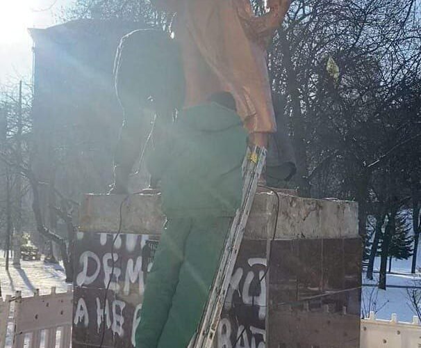 На опублікованих фото можна побачити, що робітники почали підготовчі роботи для того, щоб прибрати монумент, який встановлено на вулиці Олеся Гончара.