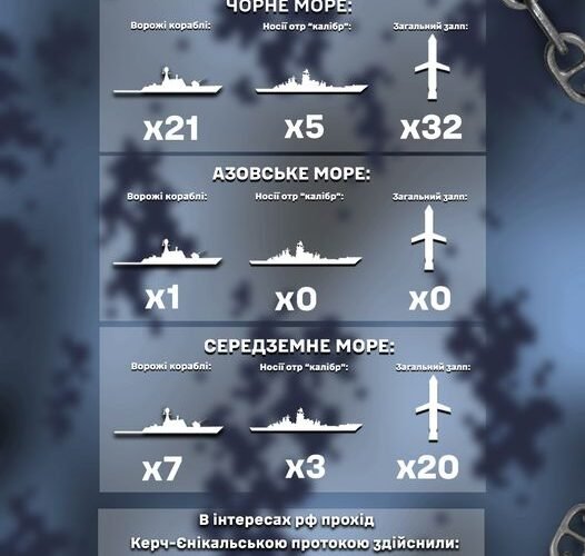 Як зазначено, в Чорному морі на бойовому чергуванні знаходиться 21 ворожий корабель, серед яких 5 носіїв крилатих ракет «калібр» загальний залп до 32 ракет.