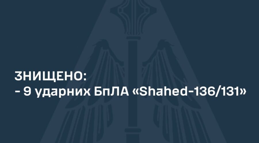 “Загалом знищено дев’ять із десяти ударних дронів: один – підрозділом ППО Сухопутних військ та вісім – силами та засобами воїнів Повітряних Сил – зенітних ракетних підрозділів та мобільних вогневих груп повітряного командування «Схід»”, – йдеться в інформації ПС ЗСУ.