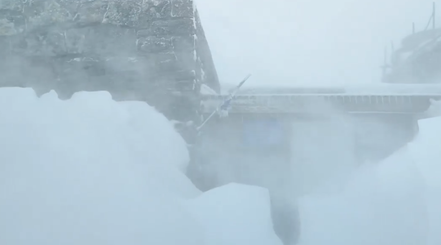 Вітер 15-17 м/с, хуртовина, падає сніг. Температура повітря -5°С.