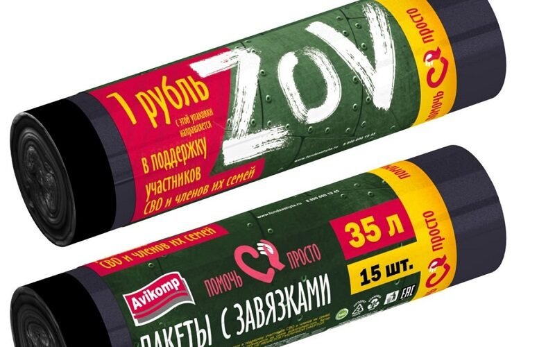 Пакети розраховані на 35 л і 60 л. Повідомляють, що з кожного рулону 1 рубль йтиме на підтримку учасників СВО, а також членів їхніх родин.