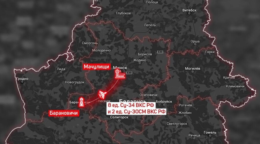 Зазначається, що в проміжку 11:20-13:10 18 травня з аеродрому «Барановичі» на аеродром «Мачулищі» перебазували 8 винищувачів Су-34 ВКС РФ і 2 Су-30СМ ВКС РФ.