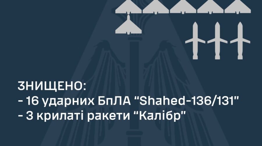 “Протягом цієї нічної атаки силами та засобами протиповітряної оборони повітряних командувань «Центр», «Захід» та «Південь» Повітряних Сил ЗС України знищено три крилаті ракети та 16 ударних дронів”, – звітують охоронці неба.