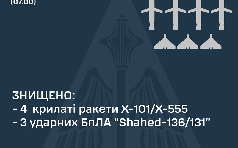 Силами та засобами протиповітряної оборони Повітряних Сил знищено чотири крилаті ракети та три ударні дрони!