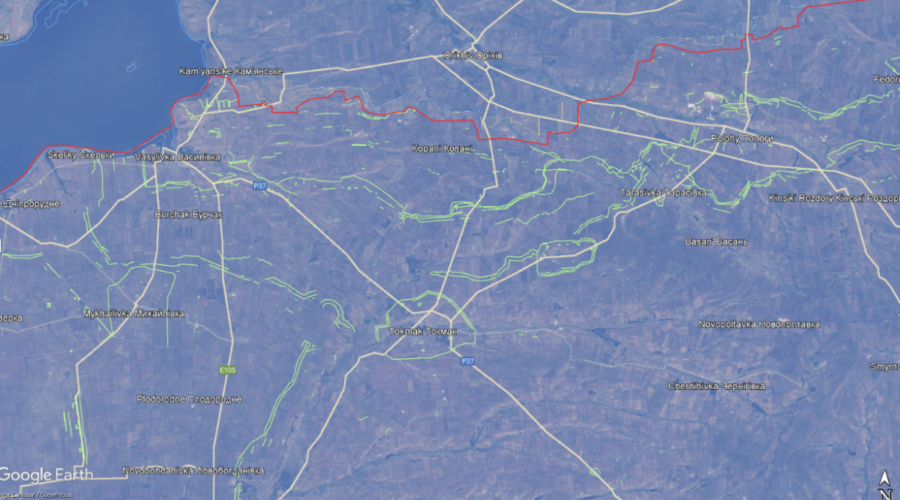 Видання оприлюднило супутникові знімки, на яких видно імпровізовану дамбу, яка розташована в межах оборонної лінії, що огинає місто Токмак, яке знаходиться за кількома іншими оборонними лініями.
