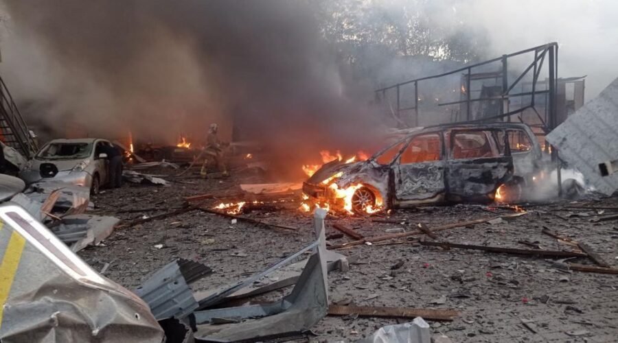 Рятувальники ліквідували наслідки влучання ракети по СТО: пожежа виникла в підсобних приміщеннях на площі 100 м.кв. Вогнем знищено п’ять автомобілів, ще три автівки та дві будівлі зазнали ушкоджень.
