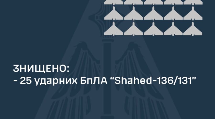 “Силами та засобами Повітряних Сил, у взаємодії із ППО Сил оборони України, знищено 25 “Shahed-131/136″, зокрема у межах Одеської, Миколаївської, Харківської, Дніпропетровської, Черкаської та Житомирської областей”, – розповіли в Повітряних силах.