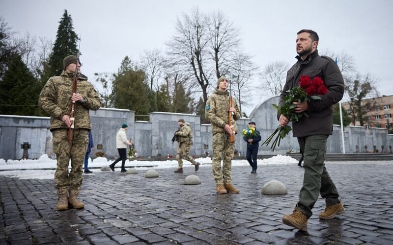 Президент України Володимир Зеленський 15 грудня прибув до Львова, де відвідав Личаківське кладовище, передає Хронікерс з посиланням на Офіс президента.