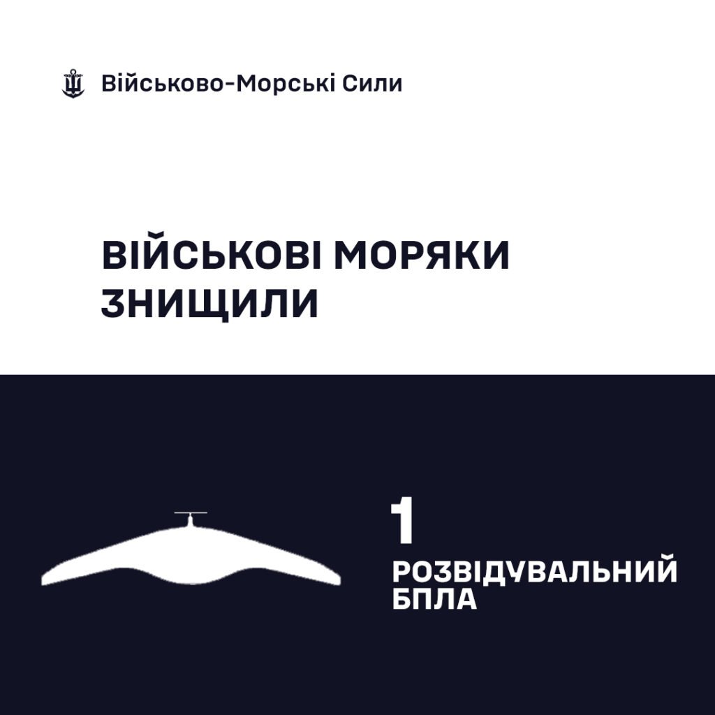 “Корабельно-катерним складом Військово-Морських Сил ЗС України було збито розвідувальний дрон рф”, – йдеться у повідомленні.