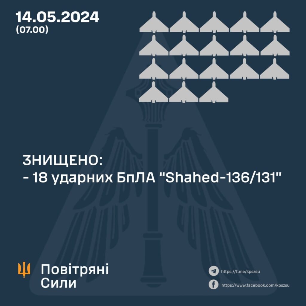 Як зазначено, в ніч на 14 травня ворог атакував 18-ма ударними БпЛА типу “Shahed-131/136” із мису Чауда та однією балістичною ракетою “Іскандер-М” з окупованого Криму.