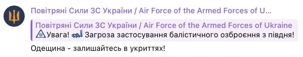 Незадовго до вибуху Повітряні сили ЗСУ попередили про загрозу застосування ворогом балістичного озброєння. Громадян закликають залишатися в укриттях до завершення тривоги.