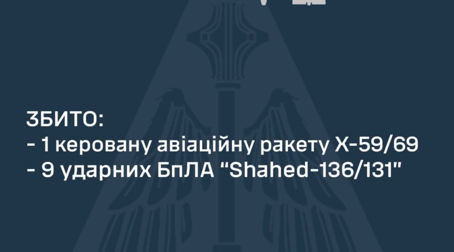 “В результаті протиповітряного бою збито керовану авіаційну ракету Х-59/Х-69 та дев’ять БпЛА Shahed-131/136. Повітряні цілі знищено у Дніпропетровській, Херсонській та Кіровоградській областях”, – звітують військові.