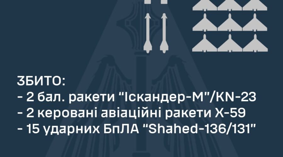 “В результаті протиповітряного бою збито дві балістичні ракети “Іскандер-М”/KN-23, дві керовані авіаційні ракети Х-59 та 15 ударних БпЛА у Київській, Херсонській, Миколаївській та Хмельницькій областях”, – звітують в Повітряних силах.