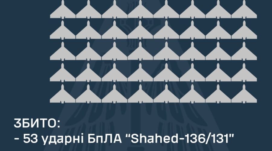“В результаті протиповітряного бою мобільними вогневими групами Сил оборони України, авіацією, зенітними ракетними підрозділами та засобами РЕБ Повітряних Сил збито 53 ворожі БпЛА у Миколаївській, Одеській, Черкаській, Вінницькій, Кіровоградській, Херсонській, Київській, Запорізькій, Сумській, Рівненській та Черкаській областях”, – повідомив Олещук.