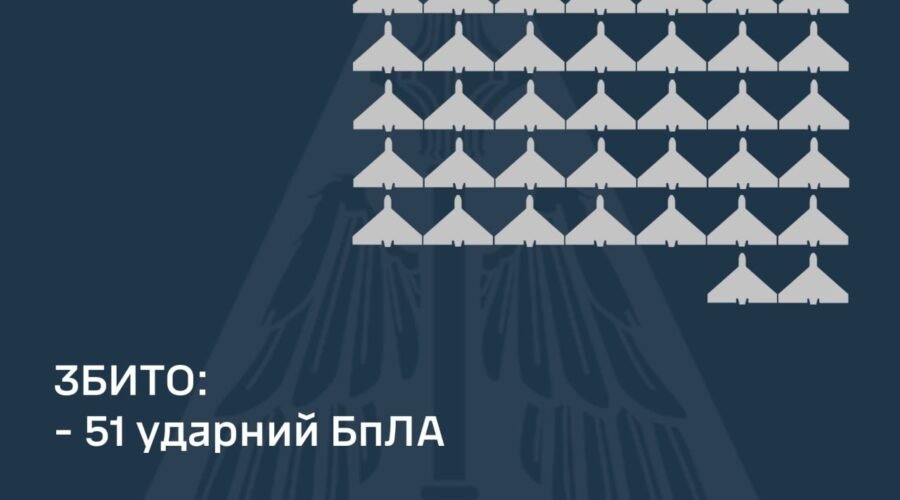 “Станом на 07:00 в результаті протиповітряного бою збито 51 ворожий БПЛА в Сумській, Черкаській, Кіровоградській, Тернопільській, Херсонській, Харківській, Житомирській, Донецькій, Дніпропетровській, Миколаївській, Київській, Полтавській, Чернігівській та Чернівецькій областях”, — йдеться у повідомленні.