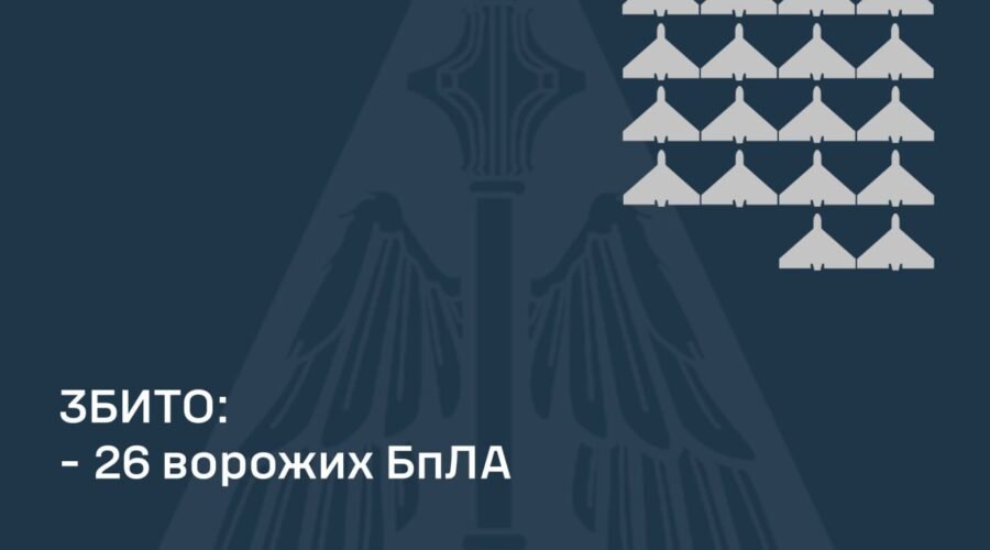 Станом на 09:00 підтверджено збиття 26 ворожих БпЛА, 20 безпілотників локаційно втрачено, один — повернувся в РФ. Інформація уточнюється та оновлюється.