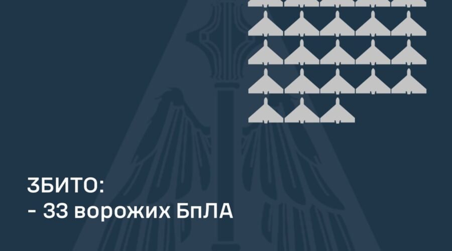 “Станом на 07.00 підтверджено збиття 33 ворожих БпЛА у Київській, Черкаській, Хмельницькій, Харківській, Запорізькій, Донецькій, Дніпропетровській, Сумській, Чернігівській та Полтавській областях”, – кажуть військові.