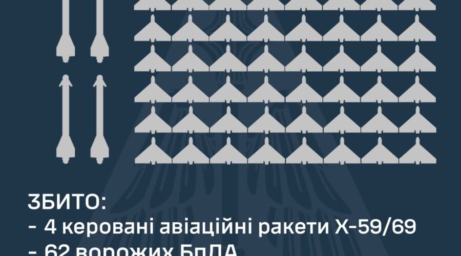 “Станом на 09:00 підтверджено збиття 4 керованих авіаційних ракет Х-59/69 та 62 ворожих БпЛА в Одеській, Миколаївській, Київській, Сумській, Харківській, Полтавській, Кіровоградській, Житомирській, Чернігівській, Дніпропетровській, Хмельницькій та Івано-Франківській областях”, – звітують військові.