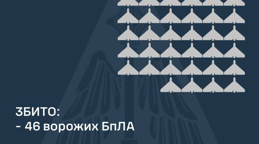 “Станом на 11.00 підтверджено збиття 46 БпЛА противника у Київській, Житомирській, Полтавській, Сумській, Харківській, Черкаській, Запорізькій, Чернігівській, Дніпропетровській та Миколаївській областях. 60 ворожих безпілотників локаційно втрачено у різних регіонах України, два російських БпЛА вийшли з повітряного простору України у напрямку Білорусі”, – звітують в Повітряних силах.