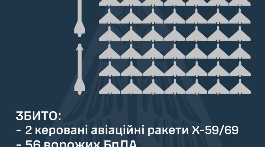“Станом на 11:00 підтверджено збиття двох керованих авіаційних ракет Х-59/69 та 56 ворожих БпЛА у Київській, Черкаській, Чернігівській, Полтавській, Кіровоградській, Житомирській, Хмельницькій, Сумській, Миколаївській, Херсонській, Запорізькій, Дніпропетровській, Донецькій та Харківській областях”, – звітують військові.