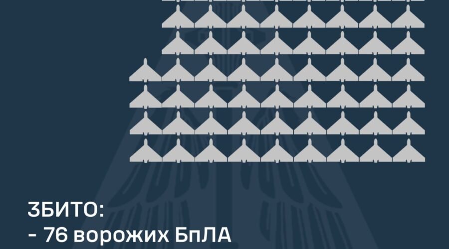Станом на 09:00 протиповітряною обороною збито 76 ворожих безпілотників у Київській, Черкаській, Кіровоградській, Чернігівській, Сумській, Харківській, Полтавській, Житомирській, Хмельницькій, Вінницькій, Чернівецькій, Тернопільській, Рівненській, Запорізькій, Дніпропетровській, Одеській та Миколаївській областях.