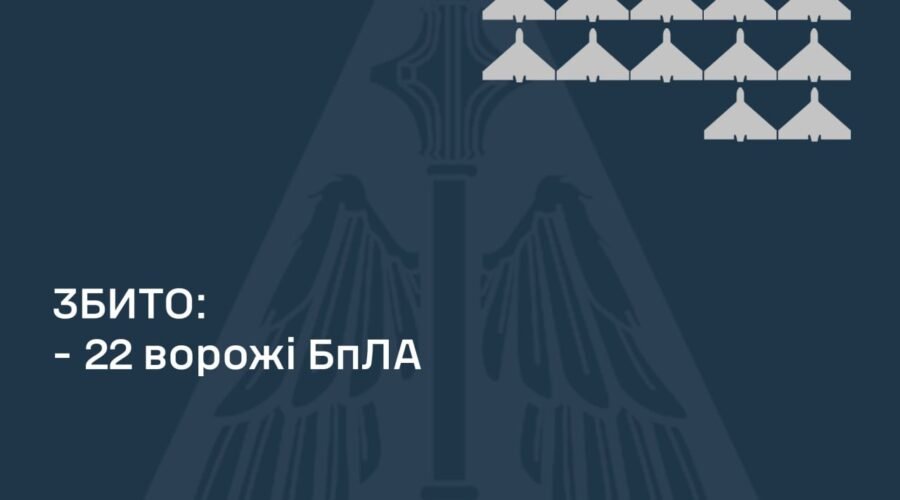 “Станом на 09:00 підрозділами зенітних ракетних військ, РЕБ та мобільних вогневих груп Повітряних Сил та Сил оборони України збито 22 ворожі БпЛА у Київській, Чернігівській, Вінницькій, Хмельницькій, Житомирській, Сумській, Одеській, Миколаївській та Дніпропетровській областях”, – звітують військові.