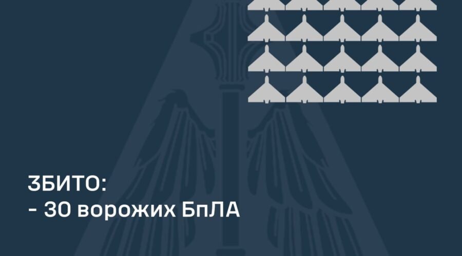 “Станом на 08:30 підрозділами зенітних ракетних військ, РЕБ та мобільних вогневих груп Повітряних Сил та Сил оборони України збито 30 ворожих БпЛА у Київській, Харківській, Полтавській, Сумській, Чернігівській, Черкаській, Кіровоградській, Житомирській, Вінницькій, Хмельницькій та Одеській областях”, – звітують у Повітряних силах.