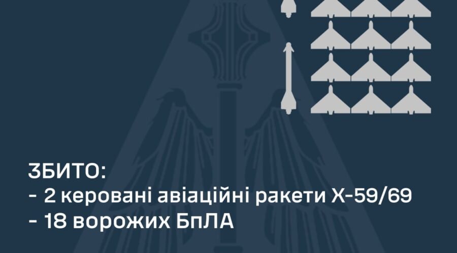 “Станом на 08:00 підрозділами зенітних ракетних військ, РЕБ та мобільних вогневих груп Повітряних Сил та Сил оборони України збито дві керовані авіаційні ракети Х-59/69 та 18 ворожих БпЛА у Сумській, Полтавській, Дніпропетровській, Чернігівській, Вінницькій, Хмельницькій, Рівненській, Тернопільській та Одеській областях”, – кажуть в ПС ЗСУ.