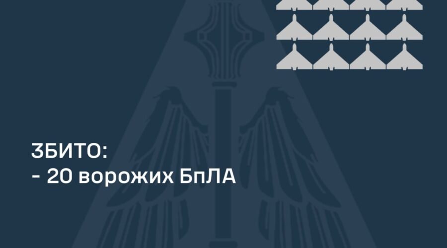 “Станом на 12:00 підтверджено збиття 20 ударних БпЛА типу “Shahed” та безпілотників інших типів у Полтавській, Сумській, Київській, Житомирській та Черкаській областях”, – звітують в Повітряних силах.