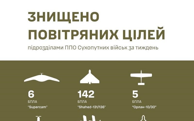 “За минулий тиждень засобами протиповітряної оборони Сухопутних військ знищено 179 засобів повітряної розвідки та нападу противника”, – йдеться у повідомленні.