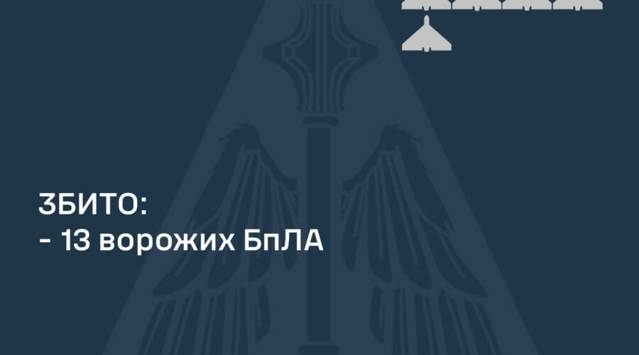 Підтверджено збиття 13 ударних БпЛА типу «Shahed» та безпілотників-імітаторів інших типів у Полтавській, Сумській, Харківській, Київській, Кіровоградській, Дніпропетровській та Донецькій областях.