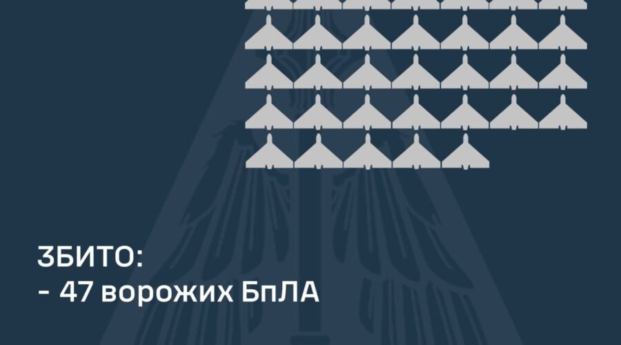 “Станом на 08:30 підтверджено збиття 47 ударних БпЛА типу “Shahed” та безпілотників інших типів у Полтавській, Сумській, Харківській, Київській, Чернігівській, Черкаській, Кіровоградській, Дніпропетровській, Одеській, Херсонській та Миколаївській областях”, – звітують в Повітряних силах.