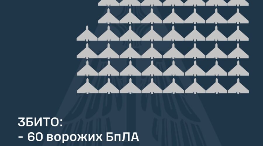 “Станом на 09:00 підтверджено збиття 60 ударних БпЛА типу “Shahed” та безпілотників інших типів у Полтавській, Сумській, Харківській, Київській, Чернігівській, Черкаській, Житомирській, Донецькій, Дніпропетровській областях”, – звітують у Повітряних силах.