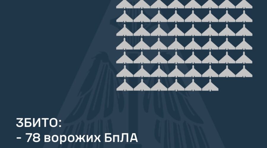 “Станом на 09:00 підтверджено збиття 78 ударних БпЛА типу “Shahed” та безпілотників інших типів у Полтавській, Сумській, Харківській, Черкаській, Чернігівській, Київській, Дніпропетровській, Миколаївській, Запорізькій, Житомирській, Хмельницькій та Донецькій областях”, – звітують військові.