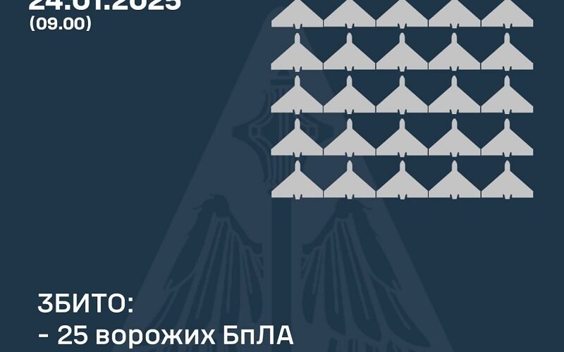 “Станом на 09.00 підтверджено збиття 25-ти ударних БпЛА типу “Shahed” та безпілотників інших типів у Сумській, Київській, Чернігівській, Черкаській, Житомирській, Хмельницькій та Львівській областях.”, – йдеться у повідомленні.