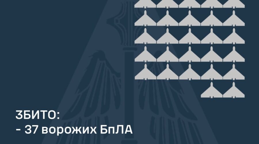 “Станом на 09:00 підтверджено збиття 37-ми ударних БпЛА у Полтавській, Сумській, Київській, Черкаській, Кіровоградській, Житомирській, Хмельницькій, Дніпропетровській, Херсонській та Одеській областях. 39 ворожих безпілотників-імітаторів локаційно втрачені”, – звітують в Повітряних силах.