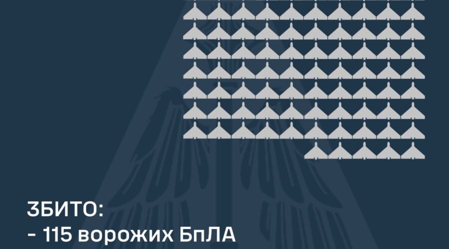 “Станом на 09:30 підтверджено збиття 115 ударних БпЛА типу Shahed та безпілотників інших типів у Харківській, Полтавській, Сумській, Чернігівській, Черкаській, Київській, Дніпропетровській, Донецькій, Миколаївській та Одеській областях. 55 ворожих безпілотників-імітаторів локаційно втрачені”, – звітують військові.