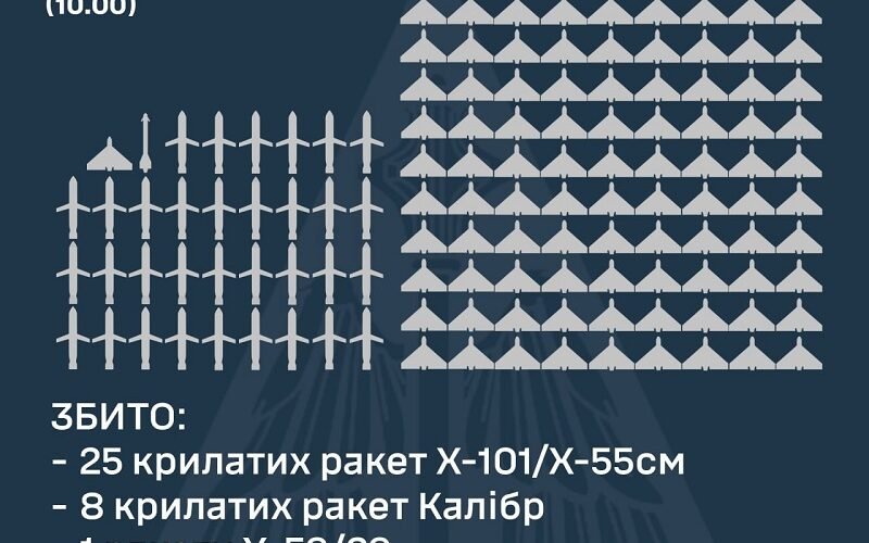 “Крім того, до десяти ворожих ракет (не входять у статистику збитих) — не досягли своїх цілей! 86 ворожих безпілотників-імітаторів — локаційно втрачені (без негативних наслідків)”, – йдеться у повідомленні.