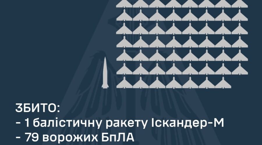 “Станом на 08:00 підтверджено збиття балістичної ракети Іскандер-М та 79 ударних БпЛА типу Shahed та безпілотників інших типів у Харківській, Полтавській, Сумській, Чернігівській, Київській, Житомирській, Вінницькій, Дніпропетровській, Запорізькій, Одеській та Херсонській областях”, – звітують військові.