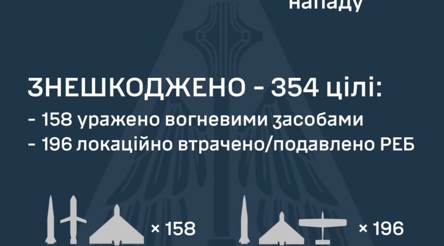 За попередніми даними, станом на 09:00 протиповітряною обороною знешкоджено 354 засоби повітряного нападу противника, 158 збито вогневими засобами, 196 – локаційно втрачені: