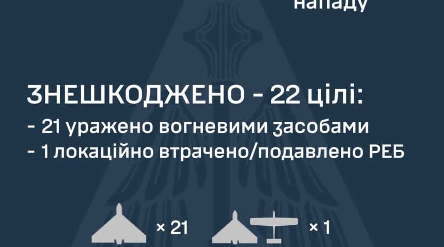 Станом на 09:00 протиповітряною обороною знешкоджено 22 ворожі БпЛА на півдні країни. 21 — збито вогневими засобами ураження, 1 — локаційно втрачений/подавлений РЕБ.
