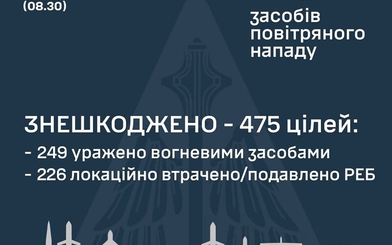 “За попередніми даними, станом на 08.30 протиповітряною обороною знешкоджено 475 засобів повітряного нападу противника, 249 збито вогневими засобами”, – йдеться у повідомленні.