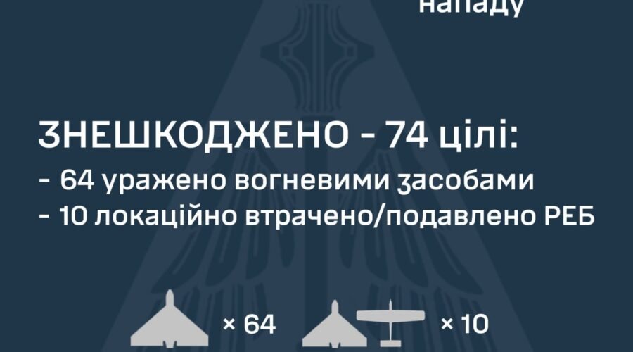 Станом на 09:00 протиповітряною обороною знешкоджено 74 ворожі БпЛА на півночі, сході та півдні країни. 64 — збито вогневими засобами ураження, 10 — локаційно втрачені/подавлені РЕБ.